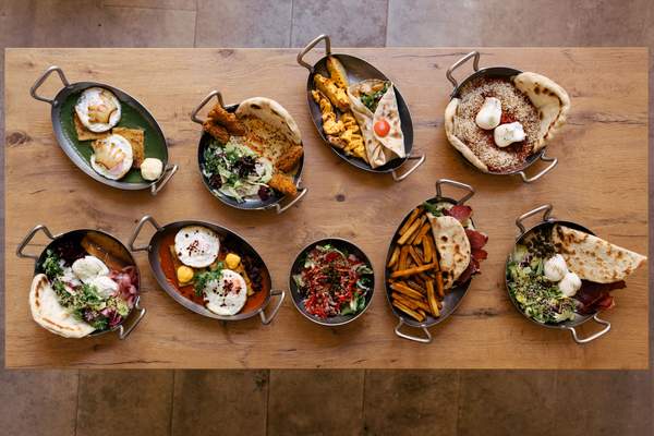 Sos shakshuka, ouă prăjite, sos iaurt, sos ardei copți, chilli prăjit, coriandru verde, turtă - 470g
