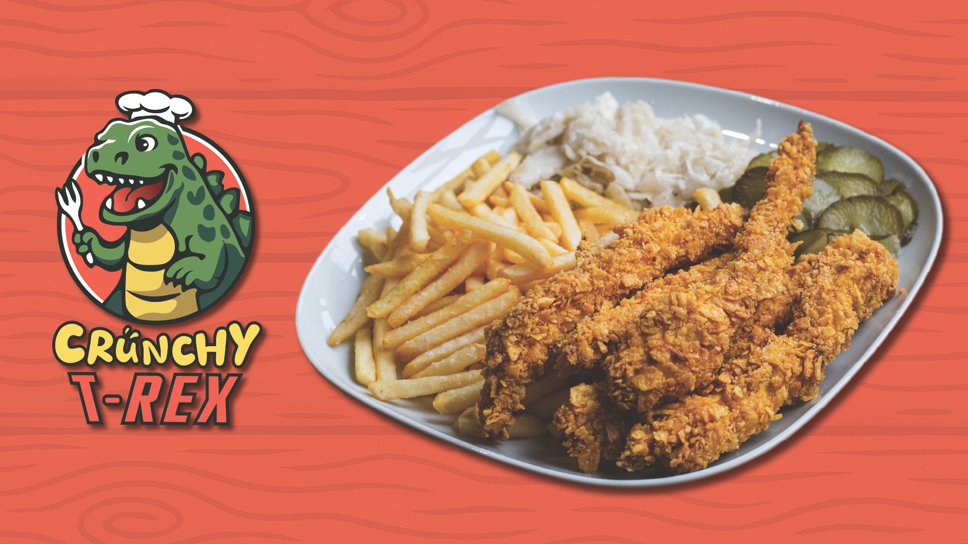 Bucăți de crispy crocante, cheddar, roșii, salată, sosurile speciale Crunchy T-Rex, chiflă și o porție de cartofi prăjiți.