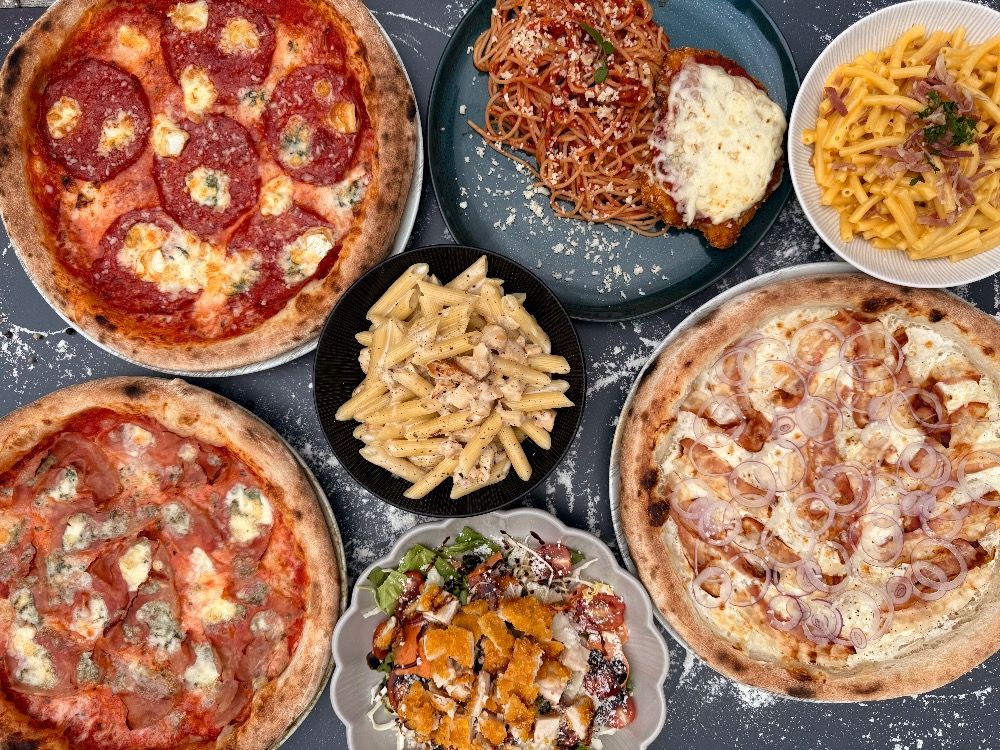 Pizza Quattro Formagi Picante 570g: blat de pizza facut in casa 270g, sos de rosii 80g, mozzarella 120g, brie 40g, gorgonzola 40g, parmezan 20g.