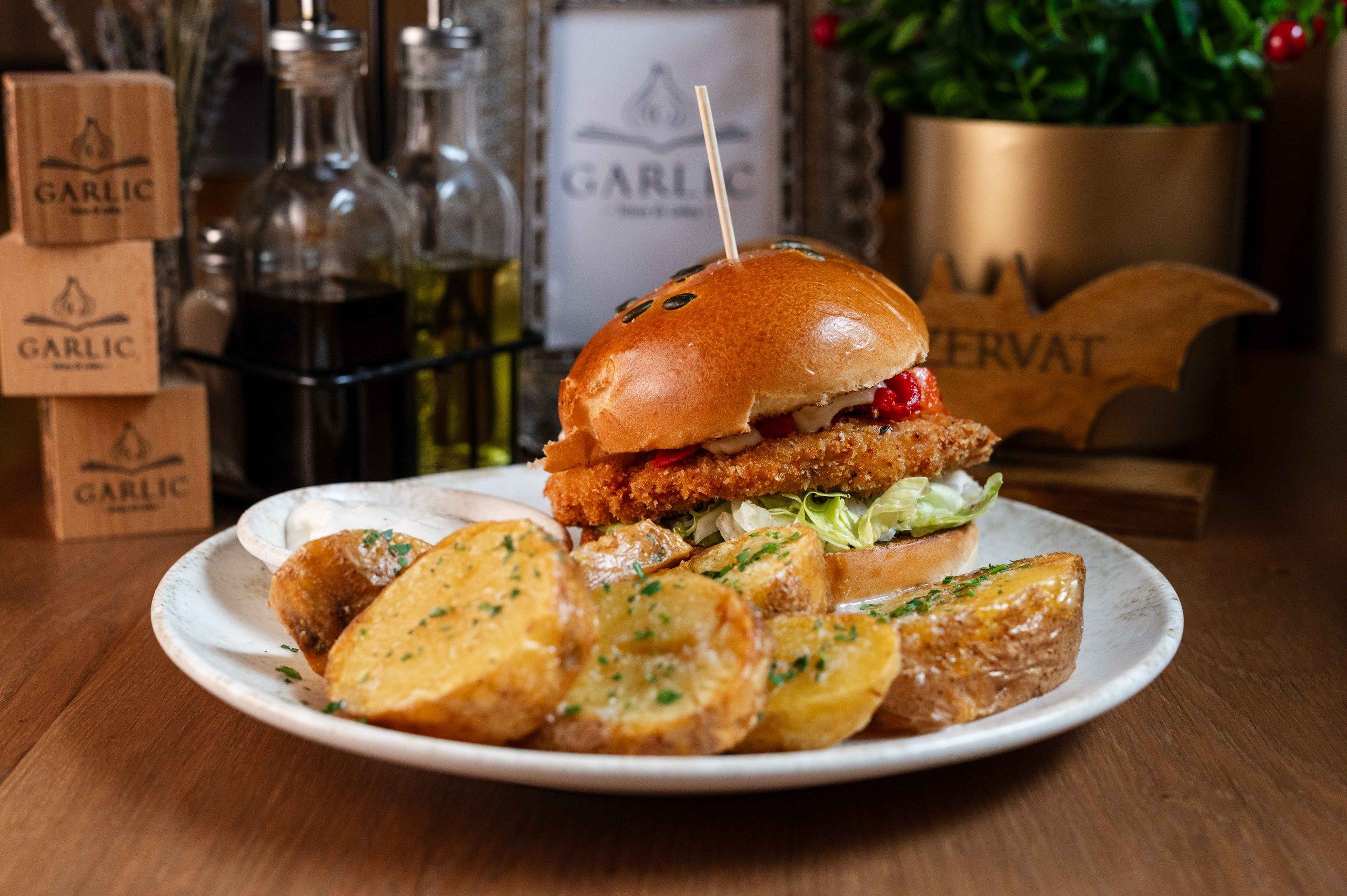 GARLIC CHICKEN BURGER CU CARTOFI RĂSCOPȚI CU USTUROI & GARLIC SOS
