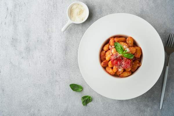 Gnocchi din cartofi cu sos pomodori din roșii proaspete completat cu mozzarella și Grana padano. Ingrediente: gnocchi cu cartofi 250g, rosii passata 91.3g, rosii cuburi 43.37g, ceapa 17.93g, busuioc 3.2g, usturoi 1.73g, zahar 1.63g, sare 1.19g, ulei din turte de masline 1.08 ml, piper 0.32g, mozzarella 60g, grana padano 20g Valori nutritionale (exprimate la 100g): KJ: 2752.0, Kcal: 658.0, Grasimi: 18.4, Acizi grasi saturati: 10.6, Glucide: 88.8, Zaharuri: 10.9, Proteine: 35.1, Fibre: 6.9, Sare: 2.1 Alergeni: Cereale care contin gluten (grau, secara, orz, ovaz, grau spelt, grau mare sau hibrizi ai acestora) si produse derivate, Crustacee si produse derivate, Oua si produse derivate, Peste si produse derivate, Arahide si produse derivate, Soia si produse derivate, Lapte si produse derivate (inclusiv lactoza), Fructe cu coaja, adica migdale (Amydalus communis L.), alune de padure (Corylus avealla), nuci (Iuglas regia), anacarde (Anacardium occidentale), nuci (Pecan [Caraya illinoiesis (Wangenh) K. Koch], nuci de Brazilia (Bertholletia excelsa), fistic (Pistacia vera), nuci de Macadamia si nuci de Queesland (Macadamia ternifolia) si produse derivate, Telina si produse derivate, Moluste si produse derivate
