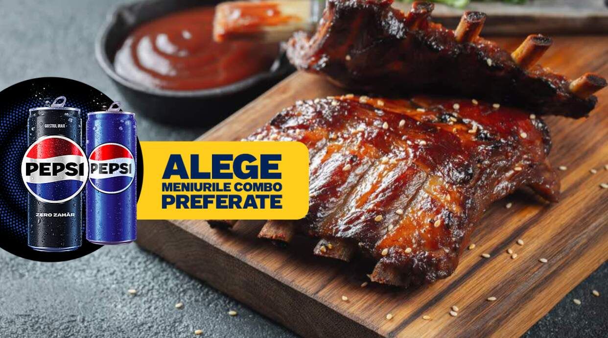 Briosa,carne de porc, castravete murat, salată, sos cheddar, Pepsi