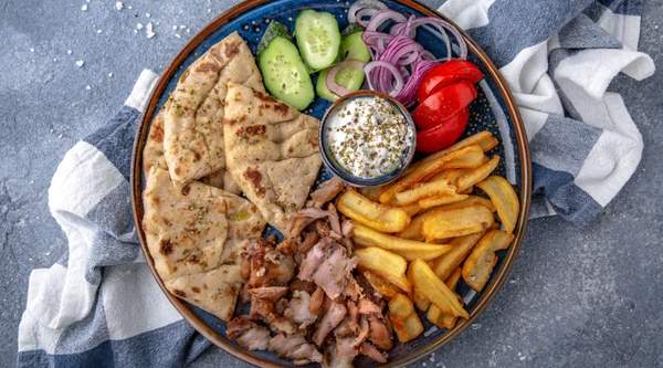 Lipie 80g, carne vita&curcan 200g, cartofi 170g, ardei copt 80g, rosii 20g, salata 100g, ceapa 10g, castraveti murati 40g, sosuri