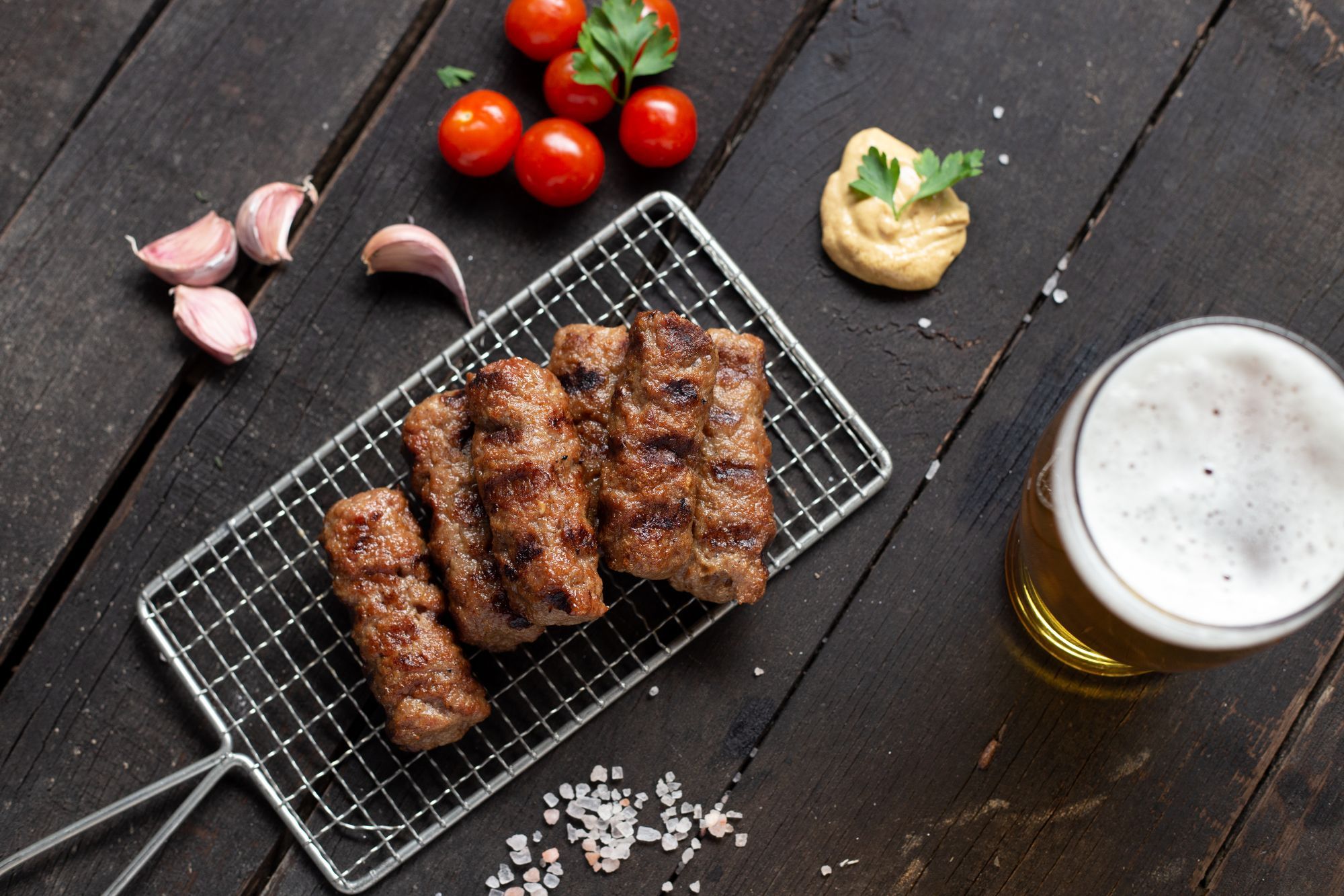 Un platou sățios pentru adevărații pofticioși: 8 mici suculenți (560 gr.), 4 cârnăciori rumeniți (240 gr.), 4 cefe fragede la grătar (640 gr.), 2 burgeri de porc (440 gr.), 4 porții de cartofi prăjiți aurii (680 gr.), 4 porții de castraveciori murați și 4 sosuri de casă (200 gr.) - 3.3 kg