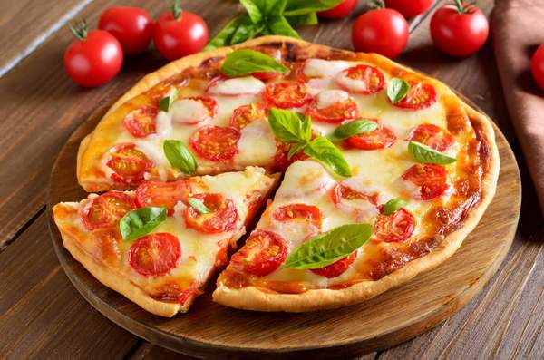 Aluat, sos pizza, rosii, cascaval, mozzarel