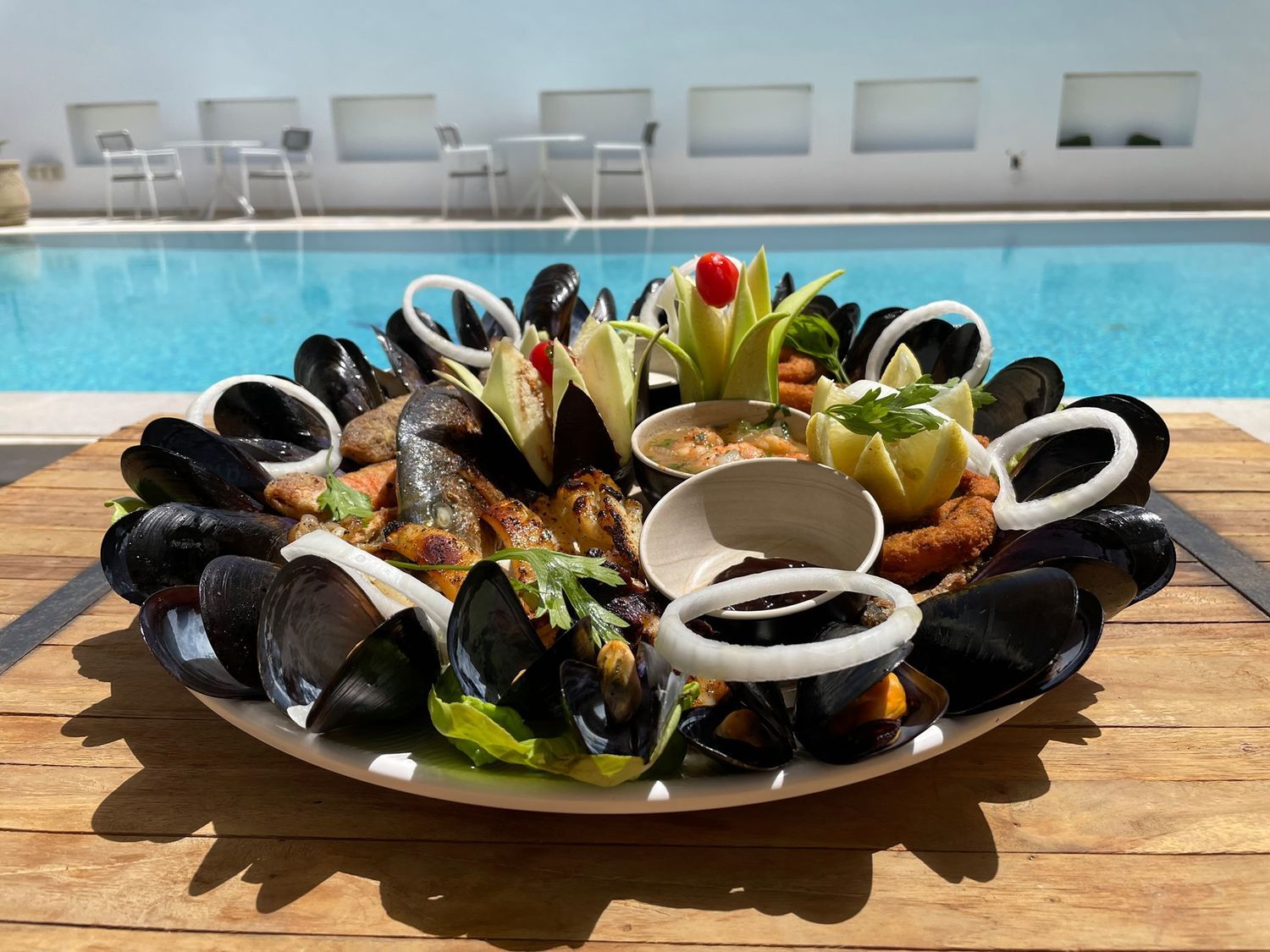 Laitue, tomate, oignon, fruit de mer, citron, huile d'olive