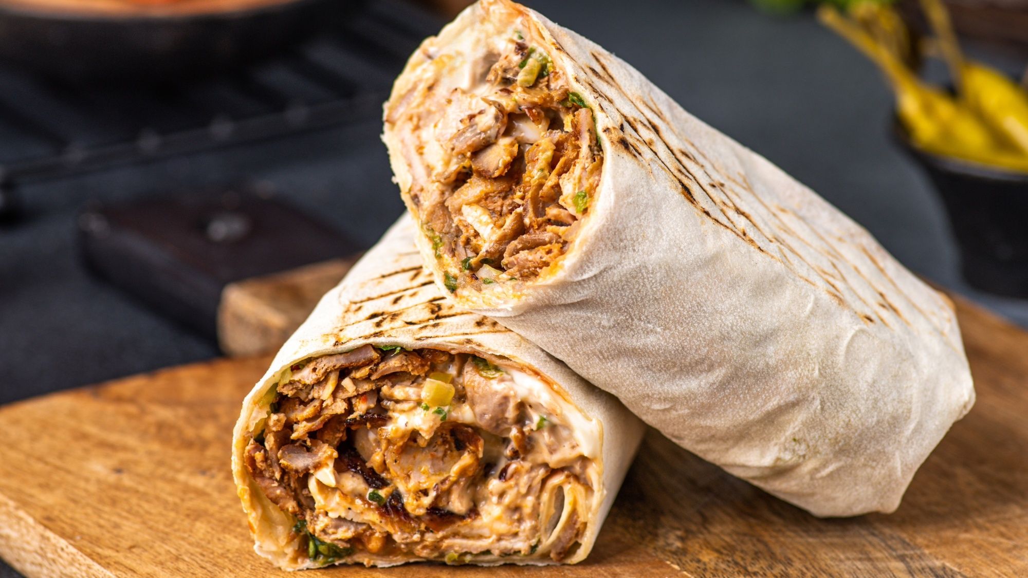 Хрумкий лаваш, покритий подушкою з овочів: цибульки Марс, листя салату, помідорчику та маринованого гострого перчику (за бажанням). Зверху кладеться та обсмажена на грилі свинина, та щедро поливається соусами: Майонезом та Кетчупом