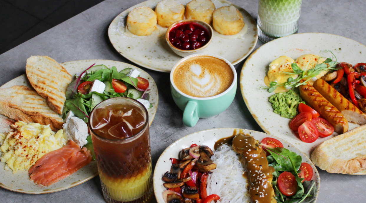 Солодовий хліб з гуакамоле, двома яйцями, вершками, пармезаном, мікс салату, томатами чері та соусом песто.