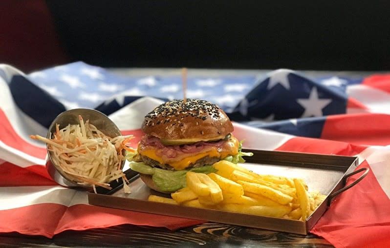 Булку печемо самі, кладемо туди соковиту яловичу котлету, хрусткий салат, "Чедер", "карамелізовану цибулю", огірочки, ніжний соус "Цезар"....просто ммм