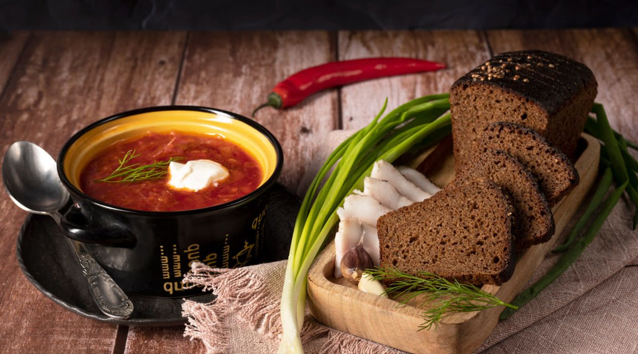 Класичний червоний борщ зі свіжих овочів на основі м'ясного бульону, подається з салом, часником та тостами чорного хлібу
