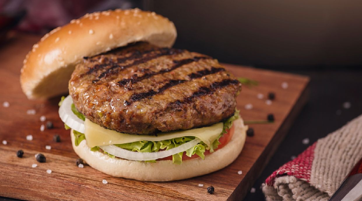 Котлета з ялович. листя Айсбергу, огірок квашений, сир Чедер, перець болгарський, Чилі, цибуля, майонез
