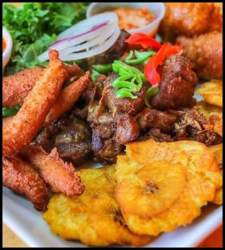 A festive platter of fried pork, fish, goat/beef, marinades, fried breadfruit, plantains and akra(crispy fried fritters made from grated malanga(yam). Served with a drink