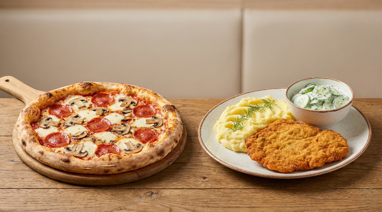 Breaded fried chicken breast cutlet, potatoes, and Polish cucumber salad