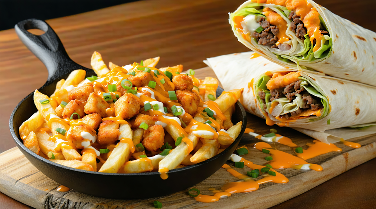Freshly cut fries with buffalo chicken topped with cheese (Chicken tenders cheese buffalo sauce)