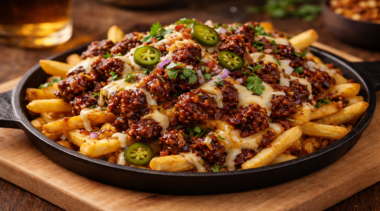 Golden Fries Layered With Smoky Barbecue Beef, Savory Glaze, Crunchy Finish