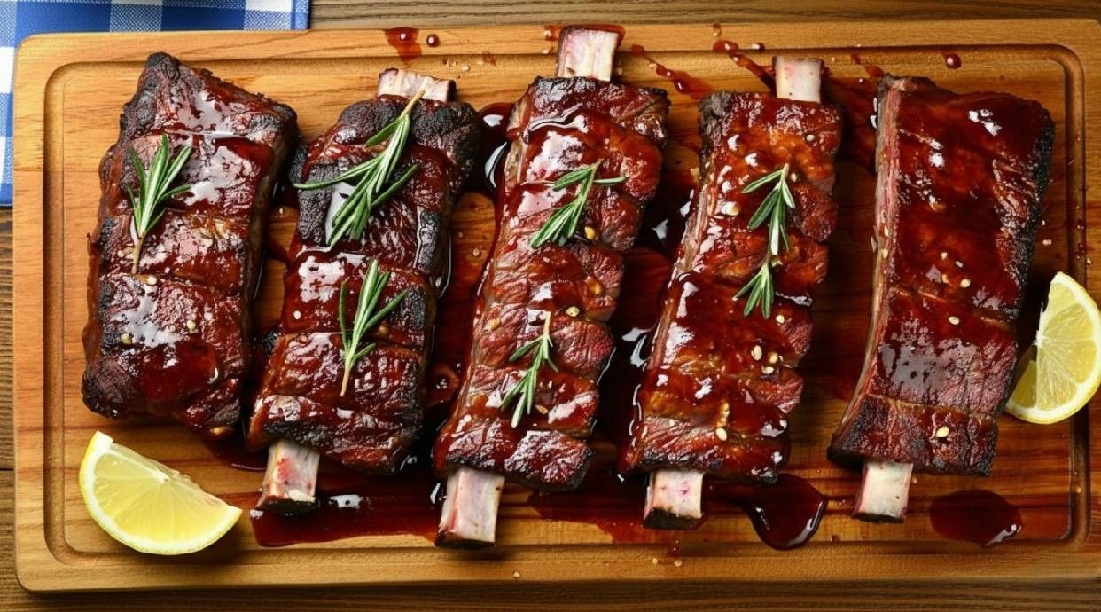 A festive meal featuring tender roasted pork ribs served with traditional steamed matooke and fresh greens.