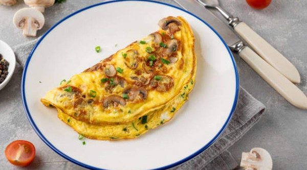Potatoe wedges, omelette, 2 sausages, 2 toasted bread, vegetable slices.