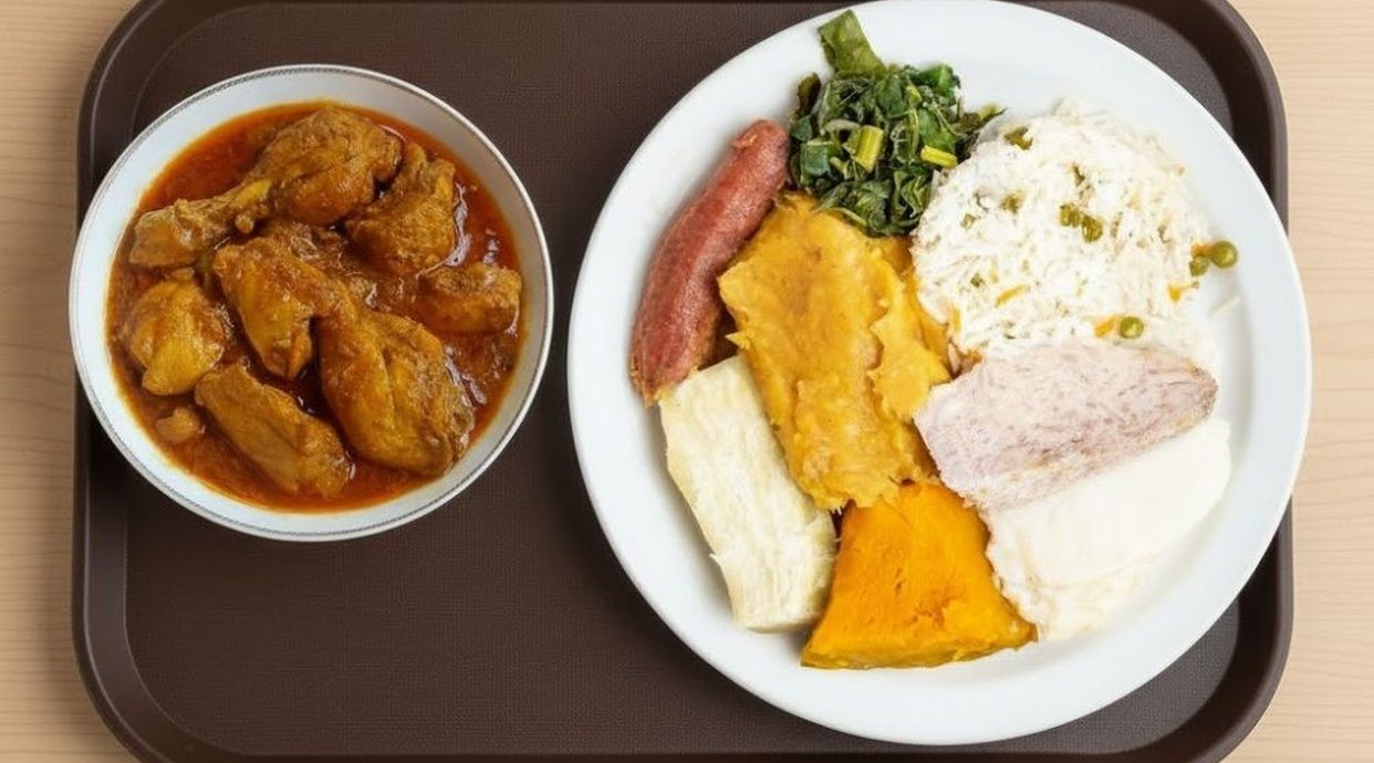 Local meal with tender chicken stew and local staples.