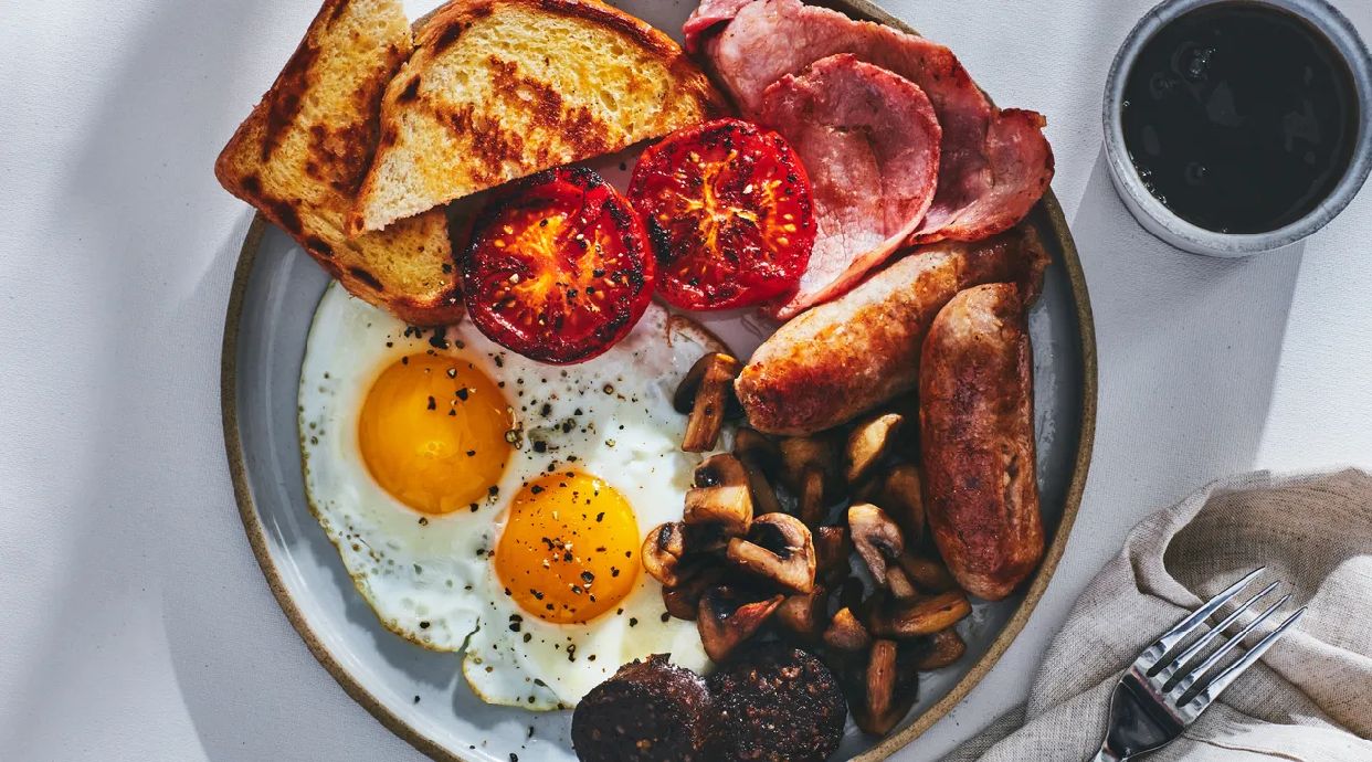 Eggs on toast, bacon, sausage, grilled tomato, fried mushrooms, Lyonnaise potatoes & baked beans