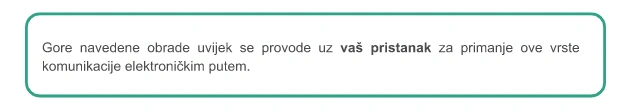 a ne želite primati nikakve marketinške komunikacije, imate pravo na odjavljivanje pretplate na bilo koju marketinšku komunikaciju slanjem e-poruke ili korištenjem poveznice koja je u tu svrhu navedena u svakoj komercijalnoj komunikaciji. Imajte na umu da ćete onemogućavanjem push obavijesti također spriječiti primanje obavijesti o statusu bilo koje narudžbe.