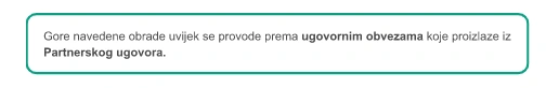- Obrada ličnih podataka“ koja se također naziva „Aktivnosti povezane s podacima“ značit će: bilo koja aktivnost koja se vrši na ili s vašim ličnim podacima, kao što je prikupljanje, organiziranje, pristup, držanje, pohranjivanje, otkrivanje, prilagođavanje, uništavanje, brisanje ili korištenje Podataka na bilo koji način