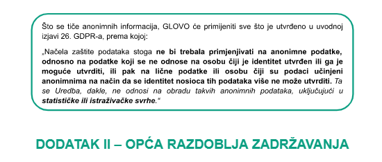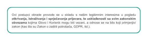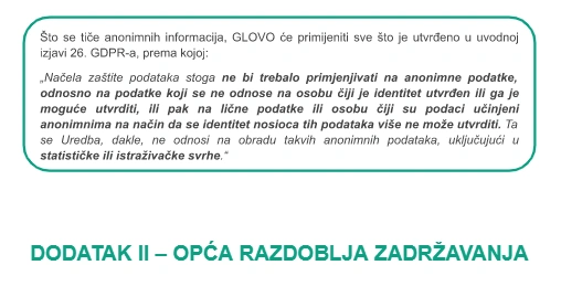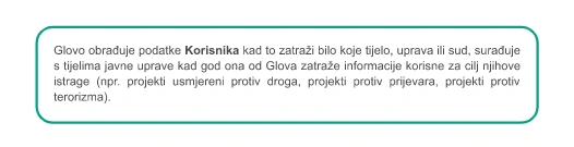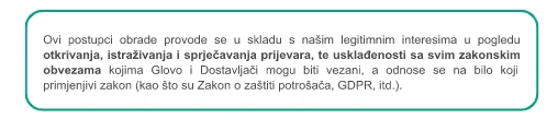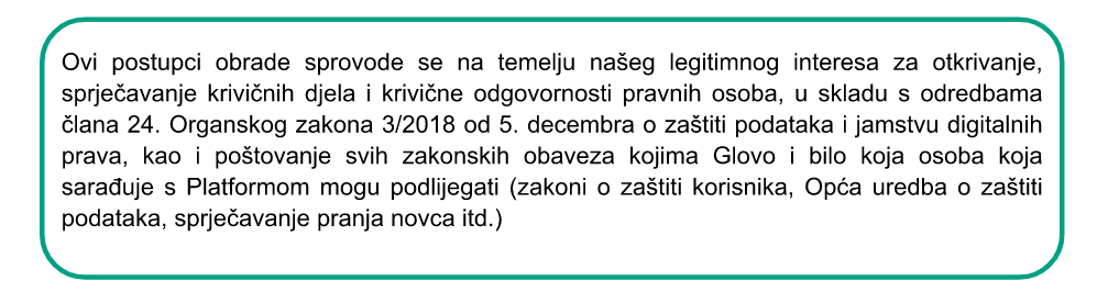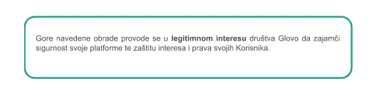 U koju svrhu koristimo vaše podatke? | Kad se nađete u ulozi Korisnika ili Dostavljača, vaše podatke možemo koristiti u: ● pravne svrhe (npr. u slučaju prijevara i zločina počinjenih na našoj aplikaciji; kako bismo se pridržavali zakonskih propisa; obrada vaših zahtjeva, pokretanja i/ili obrana bilo kakvih tužbi i pravnih radnji), ● ugovorne svrhe (npr. radi davanja mogućnosti izrade vlastitog računa, lociranja najbližeg partnera i dostavljača, vršenja obrade plaćanja, pomoći pri donošenju odluka i korištenju usluge, pružanja korisničke usluge, proučavanja vaše uporabe platforme, snabdijevanja opreme i materijala potrebnih za pružanje usluga), ● sigurnosne svrhe (npr. korištenje uređaja, lokacije, profila i drugih podataka radi sprječavanja i otkrivanja zlonamjernih ili nesigurnih aktivnosti, praćenja svih radnji koje bi mogle uzrokovati prijevaru, a kada to zahtijeva bilo koja služba, uprava ili sud, suradnja s tijelima javne uprave), ● statističke i istraživačke svrhe (npr. analiziranje trendova, ponašanje i karakteristike pri kupnji, razumijevanje kako koristite našu Platformu, slanje dobrovoljnih i anonimnih upitnika, anketa, natjecanja i komunikacija koje bi vas mogle zanimati, provođenje financijskih izračuna), ● marketinške i nemarketinške svrhe (npr. provođenje marketinških, komunikacijskih, istraživačkih i razvojnih aktivnosti, analiziranje kako poboljšati svoje usluge, slanje ponuda, promotivnih akcija, popusta i prijedloga vama, provođenje promotivnih aktivnosti za isporuku uzoraka ili besplatnih proizvoda, generiranje i dostava računa vama, obavještavanje o bilo kakvom neželjenom događaju u aplikaciji). Kad se nađete u ulozi Partnera, vaše podatke možemo koristiti kako bismo vam: ● dali mogućnost izrade vlastitog računa i održavanja poslovnog odnosa s društvom Glovo, ● pružili korisničku podršku u smislu odgovora na vaša pitanja ili konsultacije. Kad se nađete u ulozi Ulagača, vaše podatke možemo koristiti kako bismo: ● ispunili zahtjeve u pogledu usklađenosti s propisima ● formalizirali odnos s vama kao Ulagačem, ● obavijestili vas o korporativnim pitanjima i o rezultatima društva Glovo. Kad se nađete u ulozi Kandidata za radno mjesto, vaše podatke možemo koristiti kako bismo: ● razmotrili vašu sadašnju ili buduću prikladnost za bilo koju od pozicija dostupnih u Glovu, obavili sve razgovore koje smatramo potrebnima za tu poziciju, testirali vaše znanje, kontaktirali tvrtke za koje ste ranije radili, provjerili reference i procijenili vaše vještine i sposobnosti u općenitom smislu. ● pružili vam informacije koje vas zanimaju u vezi s našim ponudama poslova. Kad se nađete u ulozi Potencijalnog korisnika, vaše podatke možemo koristiti kako bismo: ● obradili vaše zahtjeve za nabavku proizvoda i/ili usluga koje nudi Glovo i upravljali našim budućim odnosom, ● provodili marketinške, komunikacijske, istraživačke aktivnosti u vezi s proizvodima i/ili uslugama koje nudi Glovo, a koji su nalik onima navedenim u vašem zahtjevu. Kad se nađete u ulozi Posjetitelja web-mjesta, vaše podatke možemo koristiti kako bismo: ● pratili vaše komentare ostavljene na web-stranici Glovo ili našem blogu, ● dali odgovor na vaš zahtjev. |