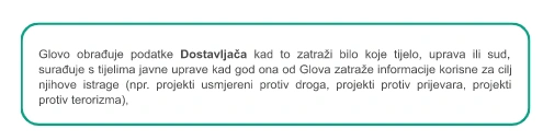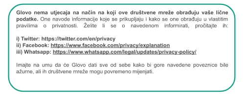 S kime dijelimo vaše podatke? | Ako ste Korisnik, vaše podatke možemo dijeliti s dvije različite skupine primatelja: 1) Primatelji podataka dok izvršavamo vaše narudžbe: 2) Primatelji podataka, tijekom radnji poduzetih radi nastavka pružanja usluga ponuđenih putem Aplikacije: pružatelji usluga koji šalju pakete, obavljaju narudžbe i/ili rješavaju neželjene događaje s dostavom; farmaceuti koji izdaju proizvode; Platforme za plaćanje koje je ugovorio Glovo; Pružatelji usluga kontrole prijevara i anonimiziranja nekih podataka; Telekomunikacijske usluge; Drugi poslovni subjekt ili povezano društvo Glovo grupe; Društveni mediji, Treće strane povezane s društvom Glovo u svrhu komercijalne komunikacije; osiguravajuća društva Ako ste Dostavljač, vaše podatke možemo dijeliti s različitom skupinom primatelja: ● savjetnici i konzultanti za obavljanje računovodstvenih, radnopravnih, poreznih, osiguravateljskih, pravnih i tehničkih poslova, ● državna tijela (porezna uprava, sistem socijalnog osiguranja itd.), ● državne snage sigurnosti, sudovi, posrednička i arbitražna tijela, vladina tijela za regulatorna pitanja ● korisnici koji su poslali narudžbu koju ste pristali izvršiti, ● vanjski pružatelji usluga koji pružaju komercijalne ponude s pogodnostima i/ili popustima za vas, ● trgovačkim društvima iz grupacije ili trećim stranama zaduženim za arhiviranje i upravljanje računalnim podacima. U slučaju svakog Nosioca podataka (Korisnici, Dostavljači, Kandidati za radna mjesta, Partneri, Ulagači, Potencijalni korisnici, Posjetitelji web-stranice) lične podatke možemo dijeliti s: ● drugim poslovnim subjektom ili ovisnim društvom Glovo grupe, ● svakim tijelom javne uprave koje zatraži dijeljenje. |