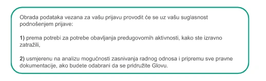 1. Glovo obavještava svoje zaposlenike i treća lica da će lične podatke dostavljene u ovom kontekstu obrađivati u različite svrhe: