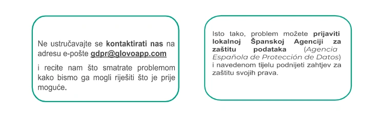 Pravo na ograničenje obrade vaših ličnih podataka kad su u pitanju tačnost, zakonitost ili potreba za obradom podataka, u kojem slučaju ih možemo zadržati za potrebe pokretanja ili obrane od pravnih radnji. - Pravo na prigovor na obradu vaših podataka kako bismo riješili bilo koji upit koji ste nam postavili putem obrasca za kontakt (web-stranica: glovoapp.com>>Kontaktirajte nas>>Pravilaili putem aplikacije: Pomoć>>Nije povezano s narudžbom>>Pravila) i pravo na prigovor na obradu vaših podataka na društvenim mrežama i/ili u svrhu obrade vašeg životopisa.