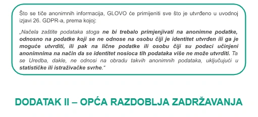 U svakom slučaju, Glovo ni u kojem slučaju neće mijenjati svoja pravila ili prakse kako bi ih učinio manje učinkovitim u zaštiti prethodno pohranjenih ličnih podataka naših korisnika.