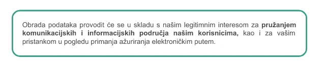 Kako bismo učinkovito obradili i riješili tvoje nedoumice, koje su sastavni dio ispunjavanja usluge koju nudimo, obrađujemo tvoje podatke temeljem pravne osnove izvršenja ugovora u skladu s GDPR-om.
