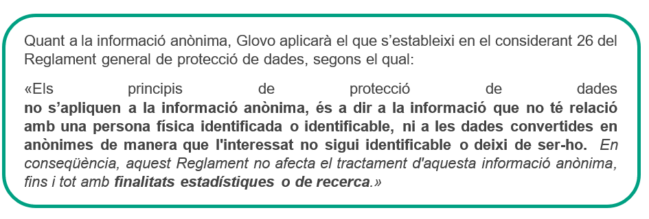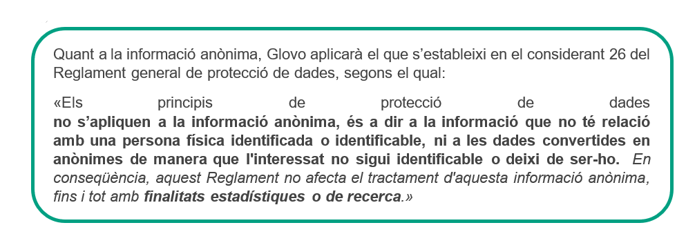 De tota manera, en cap cas Glovo no modificarà les seves polítiques o pràctiques per fer menys eficaç la protecció de les dades personals que tingui emmagatzemades dels seus clients.