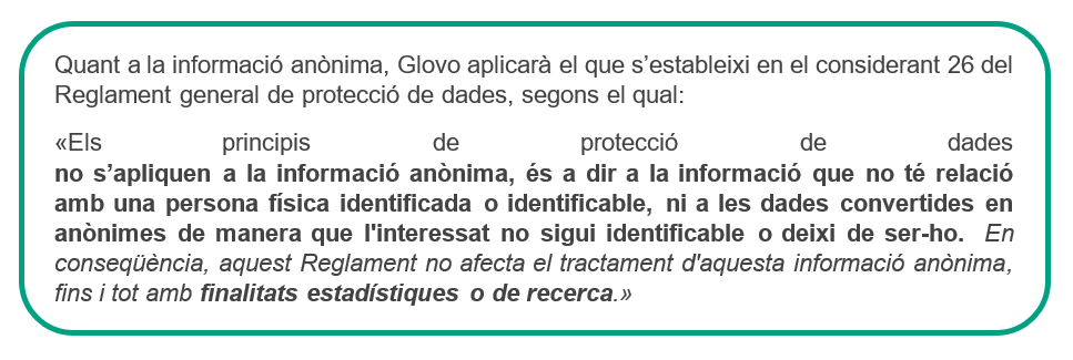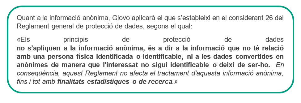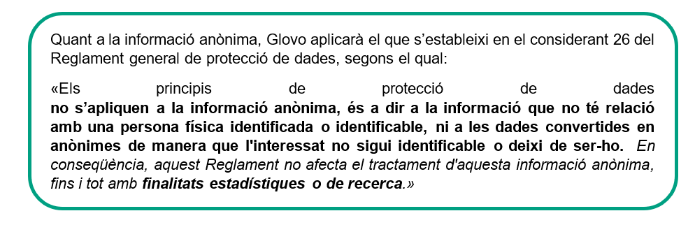 En cap cas Glovo compartirà informació sobre altres comandes (com ara de productes de supermercat o d'altres botigues) ni detalls específics com ara el nombre, l'hora o els punts de venda de les comandes que es facin a través de la plataforma.