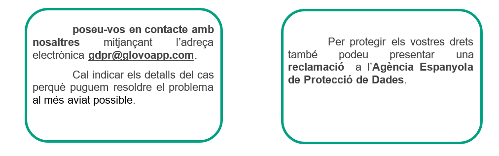 Per a qualsevol exercici dels drets de protecció de dades, feu clic AQUÍ o contacteu amb nosaltres a gdpr@glovoapp.com