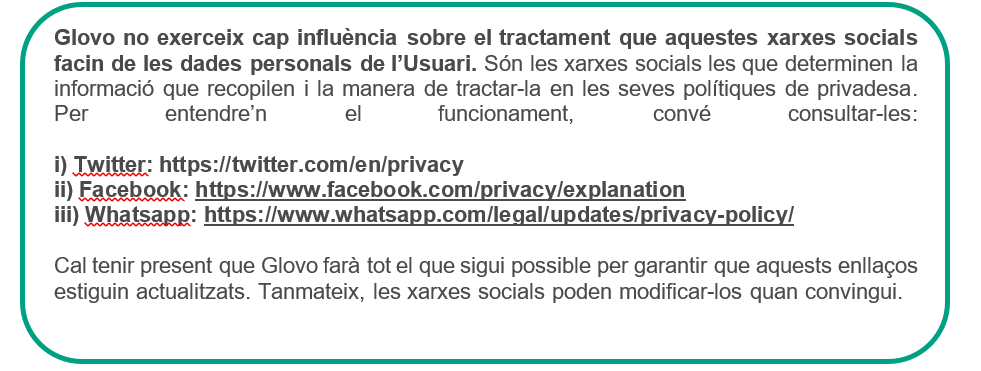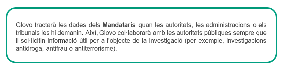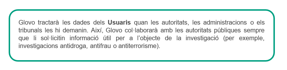 Amb qui compartim les dades? | Podem compartir les dades dels Usuaris amb dos grups de destinataris: 1) Destinataris de les dades mentre duem a terme les comandes: 2) Destinataris de les dades durant les accions realitzades per seguir prestant els serveis oferts a través de l'aplicació: proveïdors de serveis d'enviament de paquets, preparació de comandes i/o resolució d'incidències amb el lliurament; farmacèutics que enviïn productes; plataformes de pagament contractades per Glovo; proveïdors de serveis per al control del frau i per a l’anonimització d'algunes dades; serveis de telecomunicacions; una altra entitat o filial del grup Glovo; mitjans de comunicació social, tercers associats a Glovo a l’efecte de comunicacions comercials; companyies d'assegurances. Podem compartir les dades dels Mandataris amb diferents grups de destinataris: ● assessors i consultors per dur a terme activitats comptables, laborals, fiscals, d'assegurances, jurídiques i tècniques; ● organismes governamentals (autoritat fiscal, sistema de seguretat social, etc.); ● forces de seguretat de l'Estat, tribunals, organismes de mediació i arbitratge, òrgans en matèria de reglamentació; ● usuaris que han fet una comanda que el Mandatari ha acceptat; ● proveïdors de serveis externs que proporcionin ofertes comercials amb beneficis i/o descomptes per al Mandatari; ● empreses del grup o tercers encarregats d’arxivar i gestionar dades informàtiques. Podem compartir les dades de qualsevol Titular de dades (Usuaris, Mandataris, Sol·licitants de feina, Partners, Inversors, Possibles clients, Visitants del lloc web) amb: ● una altra entitat o filial del grup Glovo; ● qualsevol autoritat pública que ho demani. |