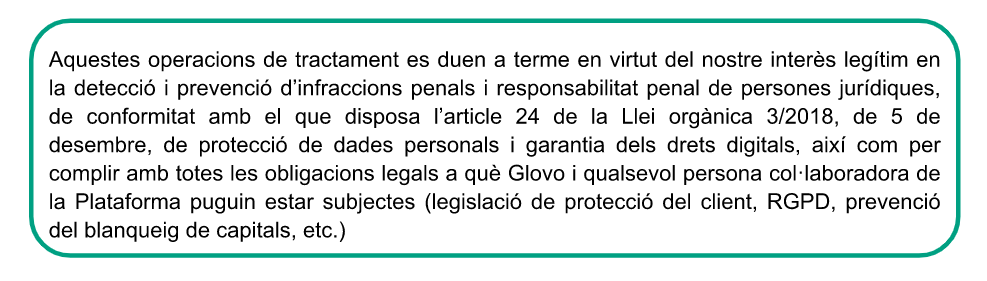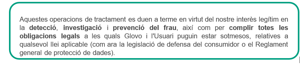 Amb quines finalitats utilitzem les dades? | Podem utilitzar les dades dels Usuaris i els Mandataris amb: ● finalitats legals (per exemple, en cas de fraus i delictes comesos a la nostra aplicació, per complir la normativa aplicable, atendre sol·licituds i atendre i/o defensar qualsevol reclamació i acció legal); ● finalitats contractuals (per exemple, per concedir-los la possibilitat de crear un compte propi, localitzar el Partner i el Mandatari més propers, tramitar els pagaments, assistir-los en les decisions i l'ús del servei, proporcionar-los un servei d'atenció al client, estudiar l'ús que fan de la plataforma o proporcionar-los l'equip i el material necessaris per prestar els serveis); ● finalitats de seguretat (per exemple, per utilitzar el dispositiu, la ubicació, el perfil, dades d'ús i altres dades a fi de prevenir i detectar activitats malicioses o insegures, controlar totes les accions que puguin causar frau, sigui perquè ho sol·licita qualsevol autoritat, administració o un tribunal, per col·laborar amb les autoritats públiques); ● finalitats estadístiques i d'investigació (per exemple, per analitzar les tendències, el comportament de compra i les seves característiques, per entendre com s’utilitza la nostra Plataforma, per enviar qüestionaris voluntaris i anònims, enquestes, concursos i comunicacions que els puguin interessar o per realitzar càlculs financers); ● finalitats comercials i no comercials (per exemple, per dur a terme activitats de màrqueting, comunicació, investigació i desenvolupament, per analitzar com millorar els nostres serveis, per oferir ofertes, promocions, descomptes i suggeriments, per realitzar activitats promocionals per al lliurament de mostres o productes gratuïts, per generar i facilitar rebuts o per informar sobre qualsevol incidència en l’aplicació). Podem utilitzar les dades dels Partners per: ● donar-los la possibilitat de crear un compte propi i mantenir la relació comercial amb Glovo; ● oferir-los un servei d' atenció al client per respondre a les seves preguntes o consultes. Podem utilitzar les dades dels Inversors per: ● complir els requisits de conformitat; ● formalitzar-hi la relació; ● notificar-los els assumptes societaris i informar-los sobre els resultats de Glovo. Podem utilitzar les dades dels Sol·licitants de feina per: ● avaluar la seva idoneïtat actual o futura per a qualsevol dels llocs de treball disponibles a Glovo, realitzar les entrevistes que considerem necessàries per al lloc, comprovar els seus coneixements, contactar amb empreses per a les quals hagi treballat anteriorment, comprovar referències i avaluar les seves aptituds i capacitats en general; ● proporcionar-los informació del seu interès sobre les nostres ofertes de feina. Podem utilitzar les dades dels Possibles clients per: ● tramitar les seves sol·licituds per obtenir els productes i/o serveis oferts per Glovo i gestionar-hi la relació; ● dur a terme activitats de màrqueting, comunicació i investigació sobre els productes i/o serveis de Glovo similars als inclosos en la seva sol·licitud. Podem utilitzar les dades dels Visitants del lloc web per: ● seguir els seus comentaris al web o al blog de Glovo; ● respondre a les seves sol·licituds. |
