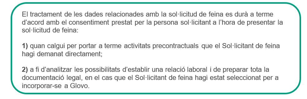- Sol·licitant de feina: qualsevol persona que sol·liciti un lloc de treball a través del lloc web o l'aplicació de Glovo.