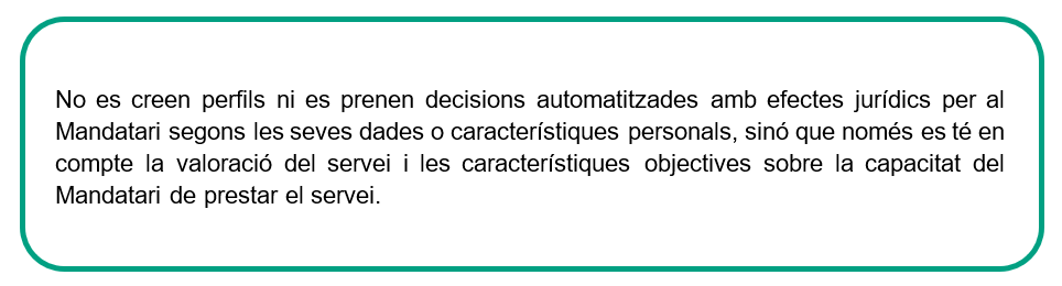 - Les decisions no es prenen únicament sobre la base del tractament automatitzat de les dades personals dels mandataris, sinó sobre la base d'una avaluació del rendiment del servei, si escau.