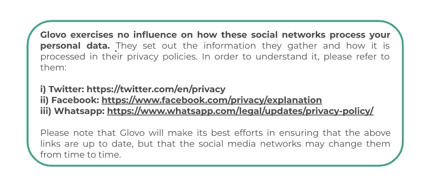 To find them, the different stakeholders involved in this processing as well as our Data Subjects can enter our main website glovoapp.com>>Contact us>>Policies, or App: Help>>Not related to an order>>Policies and there they can select the right which they wish to exercise.