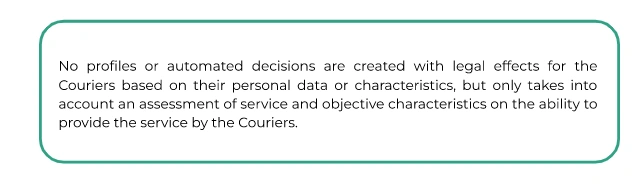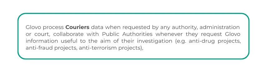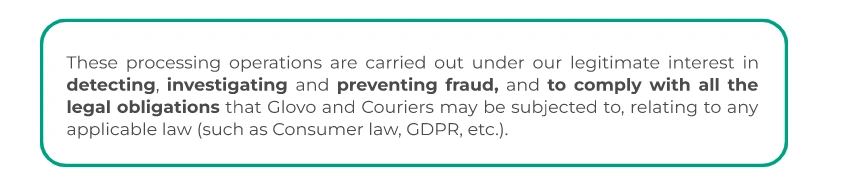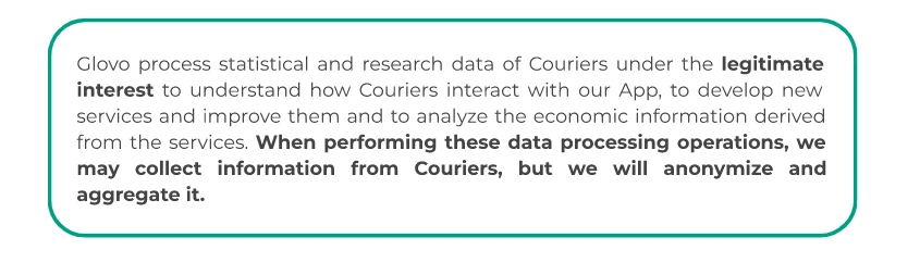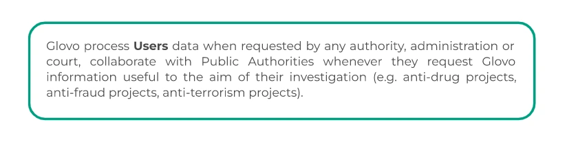 With whom we share your data? | If you are a User we may share your data with two different group of recipients: The recipients of data while we carry on your orders:the Courier who carries out the task of collecting and delivering the product; the establishment or venue in charge of selling the product; the Customer Care Services available to you; the payment Platform and payment service providers; Telecommunications service providers; Providers rendering satisfaction survey services Recipients of the data, during the actions undertaken to continue to provide the services offered through the App: service providers that send parcels, carry out orders and/or resolve incidents with delivery; pharmacists dispensing products; Payment Platforms contracted by Glovo; Service providers for fraud control purposes and for for the anonymisation of some data; Telecommunications services; Punctually another entity or affiliate of the Glovo Group; Social media, Third parties associated with Glovo for the purposes of commercial communications; insurance companies If you are a Courier we may share your data with different group of recipients: