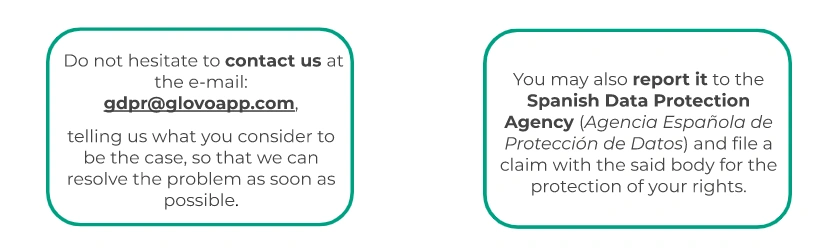 If you wish to exercise your rights or have any concerns, feel free to contact us through the form provided in our privacy policy or emailing us to gdpr@glovoapp.com.