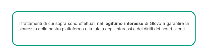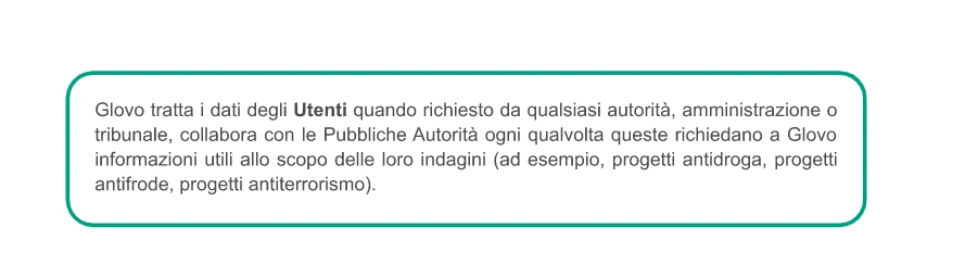 Con chi condividiamo i vostri dati? | Se siete un Utente, possiamo condividere i vostri dati con due diversi gruppi di destinatari: 1) I destinatari dei dati durante l'esecuzione dei vostri ordini: il Corriere che svolge il compito di ritirare e consegnare il prodotto; l'esercizio o il locale incaricato della vendita del prodotto; i Servizi di assistenza clienti a vostra disposizione; la Piattaforma di pagamento e i fornitori di servizi di pagamento; i fornitori di servizi di telecomunicazione; i fornitori di servizi di rilevazione della soddisfazione 2) Destinatari dei dati, nel corso delle azioni intraprese per continuare a fornire i servizi offerti attraverso l'App: fornitori di servizi di spedizione merce, eseguono ordini e/o risolvono incidenti con la consegna; farmacisti che dispensano prodotti; piattaforme di pagamento utilizzate da Glovo; fornitori di servizi per scopi di controllo delle frodi e per l'anonimizzazione di alcuni dati; servizi di telecomunicazione; un'altra entità o affiliata del Gruppo Glovo; social media, terze parti associate a Glovo per scopi di comunicazione commerciale; compagnie di assicurazione. Per tutti gli Interessati (Utenti, Candidati, Partner, Investitori, Potenziali clienti, Visitatori del sito web), possiamo condividere i dati personali con: ● un'altra entità o affiliata del Gruppo Glovo, ● qualsiasi autorità pubblica che ne richieda la condivisione. |
