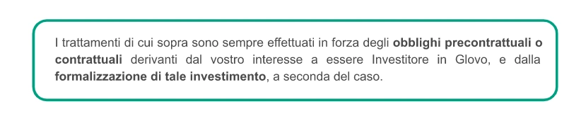 Se siete un Investitore possiamo utilizzare i vostri dati per: ● soddisfare i requisiti di conformità ● formalizzare il rapporto con voi come Investitore, ● informarvi sulle questioni aziendali e sui risultati di Glovo Se siete un candidato possiamo utilizzare i vostri dati per: