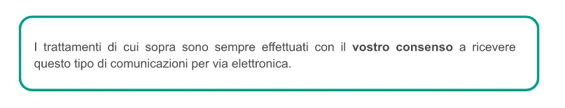 - Se siete un Utente e non desiderate ricevere comunicazioni di marketing, avete il diritto di opporvi a tale trattamento in ogni momento, revocando il consenso prestato e/o annullando l'iscrizione a qualsiasi comunicazione di marketing, inviando un'e-mail o utilizzando il link fornito a tale scopo in ogni comunicazione commerciale.