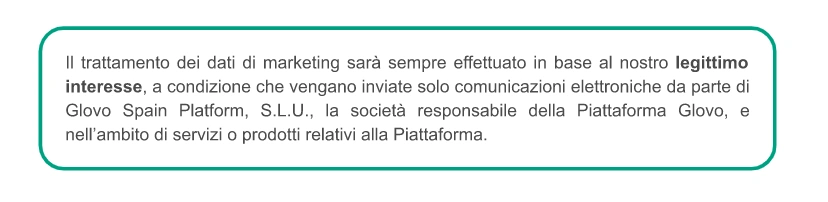 I vostri diritti | Potete esercitare i vostri diritti relativi ai dati personali in qualsiasi momento QUI, oppure inviandoci un'e-mail a: gdpr@glovoapp.com. I vostri diritti relativi ai dati personali: diritto di accesso, diritto di rettifica, diritto alla cancellazione, diritto di opposizione al trattamento, diritto di opposizione ai trattamenti basati sull’interesse legittimo, diritto di annullare l’iscrizione a qualsiasi comunicazione di marketing e di revocare il consenso prestato, diritto alla limitazione del trattamento, diritto alla portabilità dei dati |
