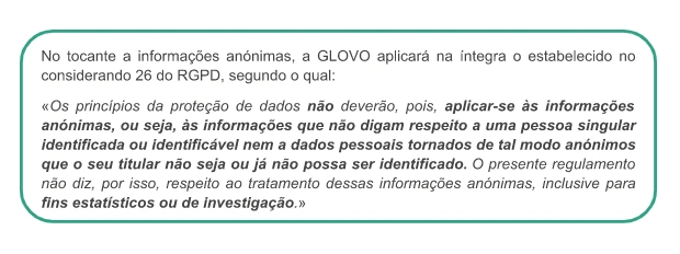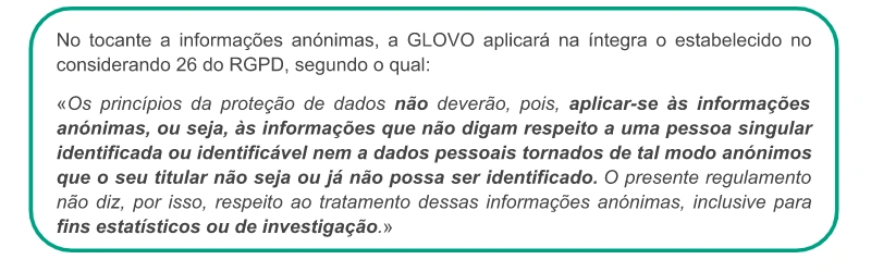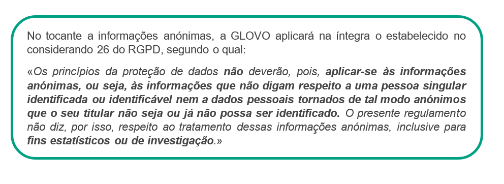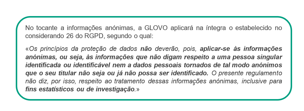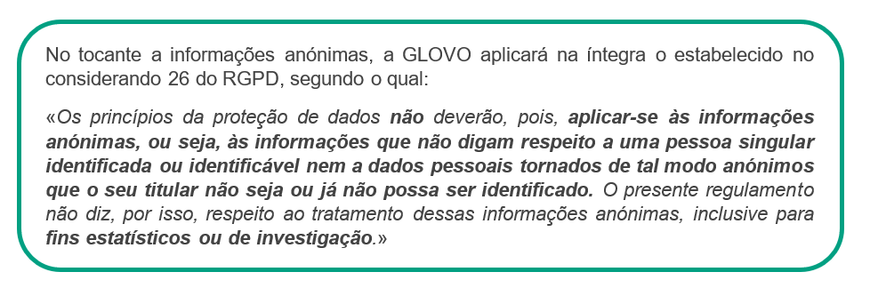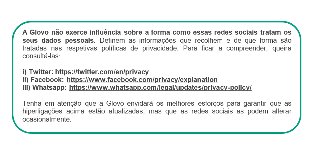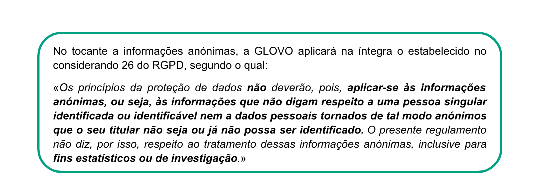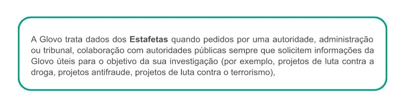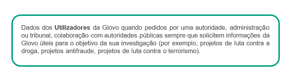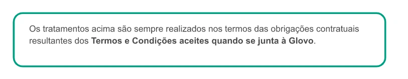 Com quem partilhamos os seus dados? | Caso seja um Utilizador, podemos partilhar os seus dados com dois grupos diferentes de destinatários: 1) Os destinatários de dados enquanto tratamos dos seus pedidos: 2) Destinatários dos dados, durante ações realizadas para continuar a prestar os serviços oferecidos através da Aplicação: prestadores de serviços que enviam encomendas, tratam de pedidos e/ou resolvem incidentes com a entrega; farmacêuticos que procedem à dispensa de produtos; plataformas de pagamento contratadas pela Glovo; prestadores de serviços para efeitos de controlo de fraudes e para a anonimização de alguns dados; serviços de Telecomunicações; Ocasionalmente outra entidade ou filial do Grupo Glovo; redes sociais, terceiros associados à Glovo para efeitos de comunicações comerciais; companhias de seguros Caso seja um Estafeta podemos partilhar os seus dados com diferentes grupos de destinatários: ● conselheiros e consultores para a realização de atividades contabilísticas, laborais, fiscais, de seguros, jurídicas e técnicas, ● organismos públicos (autoridade fiscal, sistema de seguridade social, etc.), ● forças de segurança pública, tribunais, órgãos de mediação e de arbitragem, autoridades para questões regulamentares, ● utilizadores que fizeram um pedido que aceitou realizar, ● prestadores de serviços externos que disponibilizam ofertas comerciais com benefícios e/ou descontos para si, ● a empresas do grupo ou terceiros responsáveis pelo preenchimento e a gestão de dados informáticos. No caso de todos os Titulares dos Dados (Utilizadores, Candidatos a Emprego, Parceiros, Investidores, Potenciais Parceiros, Visitantes do sítio Web) podemos partilhar dados pessoais com: ● outra entidade ou filial do Grupo Glovo, ● qualquer autoridade pública que solicite a partilha. |