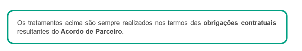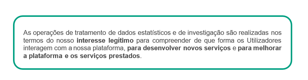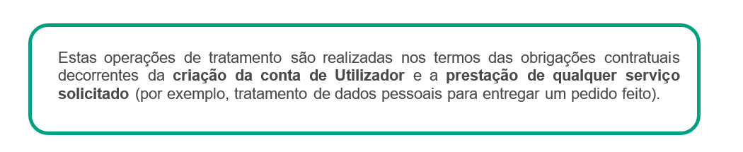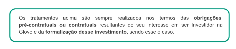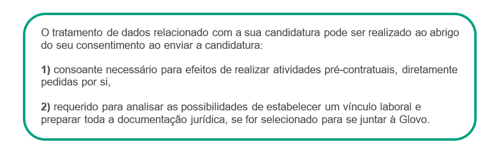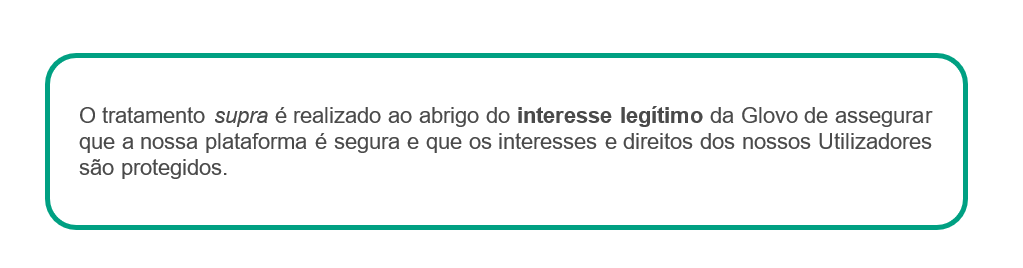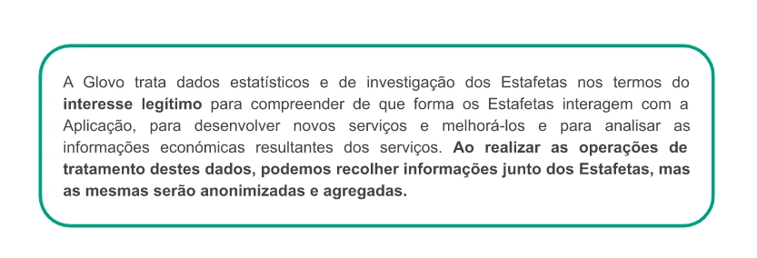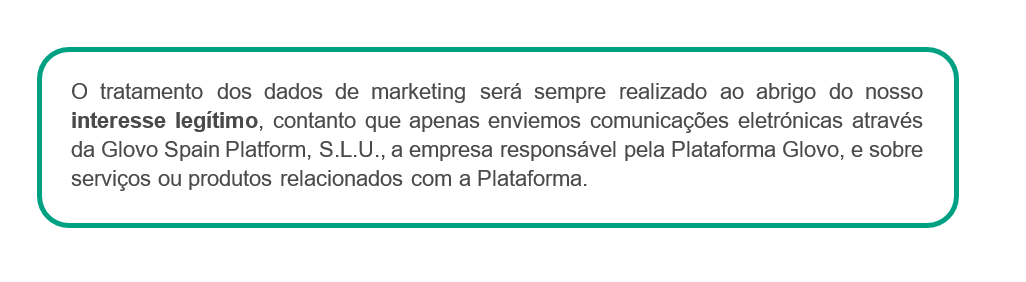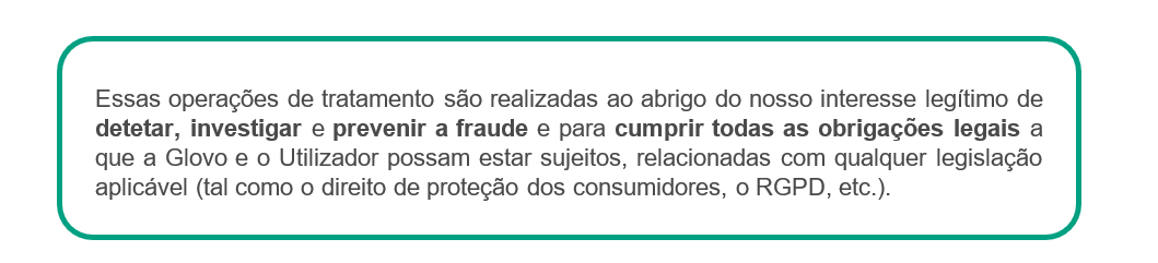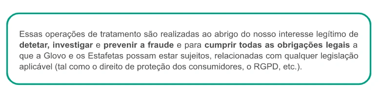 Para que finalidade usamos os seus dados? | Caso seja um Utilizador ou Estafeta, podemos usar os seus dados para: ● fins legais (por exemplo, em caso de fraudes e crimes cometidos na nossa Aplicação; para cumprir disposições jurídicas; gerir os seus pedidos; para apresentar e/ou defender pedidos de indemnização e ações judiciais), ● fins contratuais (por exemplo, dar a possibilidade de criar a sua própria conta, localizar o Parceiro e Estafeta mais próximo, realizar o processamento de pagamentos, auxiliar em decisões e na utilização do serviço, disponibilizar-lhe um serviço de apoio ao cliente, estudar a utilização que faz da plataforma, fornecer-lhe o equipamento e material necessários para prestar os serviços), ● fins de segurança (por exemplo, utilizar dados do dispositivo, de localização, de perfil, de utilização e outros dados para prevenir e detetar atividades não seguras, monitorizar todas as ações que possam constituir fraude, quando solicitado por uma autoridade, administração ou tribunal, colaborar com autoridades públicas), ● fins estatísticos e de investigação (por exemplo, analisar tendências, comportamento e características de compra, compreender de que forma usa a nossa Plataforma, enviar questionários voluntários e anónimos e estudos, concursos e comunicações do seu interesse, realizar cálculos financeiros), ● fins de marketing e fins não relacionados com marketing (por exemplo, realizar atividades de marketing, comunicações, investigação e desenvolvimento, analisar como melhorar os nossos serviços, prestar-lhe ofertas, promoções, descontos, sugestões, realizar atividades promocionais para a entrega de amostras ou produtos gratuitos, criar e fornecer-lhe receitas, informá-lo sobre um incidente na Aplicação). Caso seja um Parceiro, podemos usar os seus dados para: ● dar-lhe a possibilidade de criar sua própria conta e manter a relação comercial com a Glovo, ● prestar-lhe serviço de apoio ao cliente para responder às suas questões ou consultas. Caso seja um Investidor, podemos usar os seus dados para: ● cumprir os requisitos de conformidade, ● formalizar a relação consigo enquanto um investidor, ● notificá-lo sobre as questões societárias e informá-lo sobre os resultados da Glovo. Caso seja um Candidato a Emprego, podemos usar os seus dados para: ● considerar a sua adequação presente ou futura para qualquer um dos cargos disponíveis na Glovo, para realizar entrevistas que possa considerar necessárias para o cargo, testar os seus conhecimentos, contactar empresas para as quais trabalhou anteriormente, verificar referências e avaliar as suas competências e aptidões em geral. ● fornecer-lhe informações do seu interesse em relação às nossas ofertas de emprego. Caso seja um Potencial Parceiro, podemos usar os seus dados para: ● processar os seus pedidos para obter produtos e/ou serviços oferecidos pela Glovo e gerir a potencial relação, ● realizar atividades de marketing, de comunicação, de investigação sobre produtos e/ou serviços da Glovo semelhantes aos incluídos no seu pedido. Caso seja um Visitante do Sítio Web, podemos usar os seus dados para: ● fazer o acompanhamento dos seus comentários deixados no sítio Web ou no Blogue da Glovo, ● dar-lhe a resposta sobre o seu pedido. |