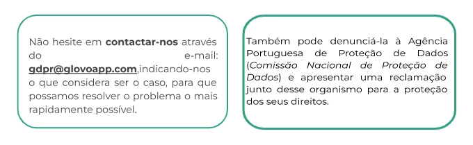 Os seus direitos | Pode exercer os seus direitos relacionados com dados pessoais, em qualquer altura AQUI, ou enviando-nos um e-mail para: gdpr@glovoapp.com. |