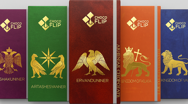 Հավաքածուն ներառում է - Վանի Թագավորություն/Kingdom of Van - Երվանդունիներ/Ervanduniner - Արտաշեսյաններ/Artashesyanner - Արշակունիներ/Arshakuniner - Բագրատունիներ/Bagratuniner - Կիլիկիայի թագավորություն/Kingdom of Kilikia Մեծ Հայք՝ հող, որտեղ պատմությունը չի մոռացվում, այլ հալչում է շոկոլադի պես։ Սա ուղակի քաղցրավենիք չէ, սա ճամփորդություն է դեպի մեր անցյալը։ Տուփ, որի մեջ ժամանակը կանգ է առել, իսկ հիշողությունը դարձել է ճաշակելի։ Քո առաջ՝ վեց սրբազան դարպաս, վեց փառահեղ թագավորություն։ Նրանք ապրում են այս սալիկների մեջ։ Նրանք ապրում են՝ մեր լեզվի մեջ, մեր աչքի փայլում, մեր անավարտ պայքարում։ Չմնաց, աշխարհում գրեթե չմնաց ցեղ, որ մեր բազկի ուժը չզգար։ Գ. Նժդեհ Եվ այդ ուժը, հիմա հանգիստ հալչում է քո շուրթերին՝ հիշեցնելով, թե ով ենք մենք։ Այս տուփը քեզ հիշեցնում է, որ Մեծ Հայքը դեռ կա, այն մեր մեջ է... Բացիր, համտեսիր և ժառանգիր։ Տուփը պարունակում է 6 տարբեր միջուկներով շոկոլադե սալիկ��եր, յուրաքանչյուրի քաշը՝ 250գր։ Greater Armenia - A land where history is not forgotten — it melts like chocolate. This is not just a sweet; it is a journey into our past. A box where time stands still, and memory becomes something you can taste. Behind you-six sacred gates, six glorious kingdoms. They live through these chocolate bars. They live — in our language, in the spark of our eyes, in our unfinished struggle. ""There is hardly a nation left in the world that has not felt the strength of our arm."" — Garegin Nzhdeh And now, that very strength melts softly on your lips, reminding you who we are. This box reminds you: Greater Armenia still exists — it lives within us. Open it, taste it, inherit it. The box contains 6 chocolate bars with different fillings, each weighing 250 grams."