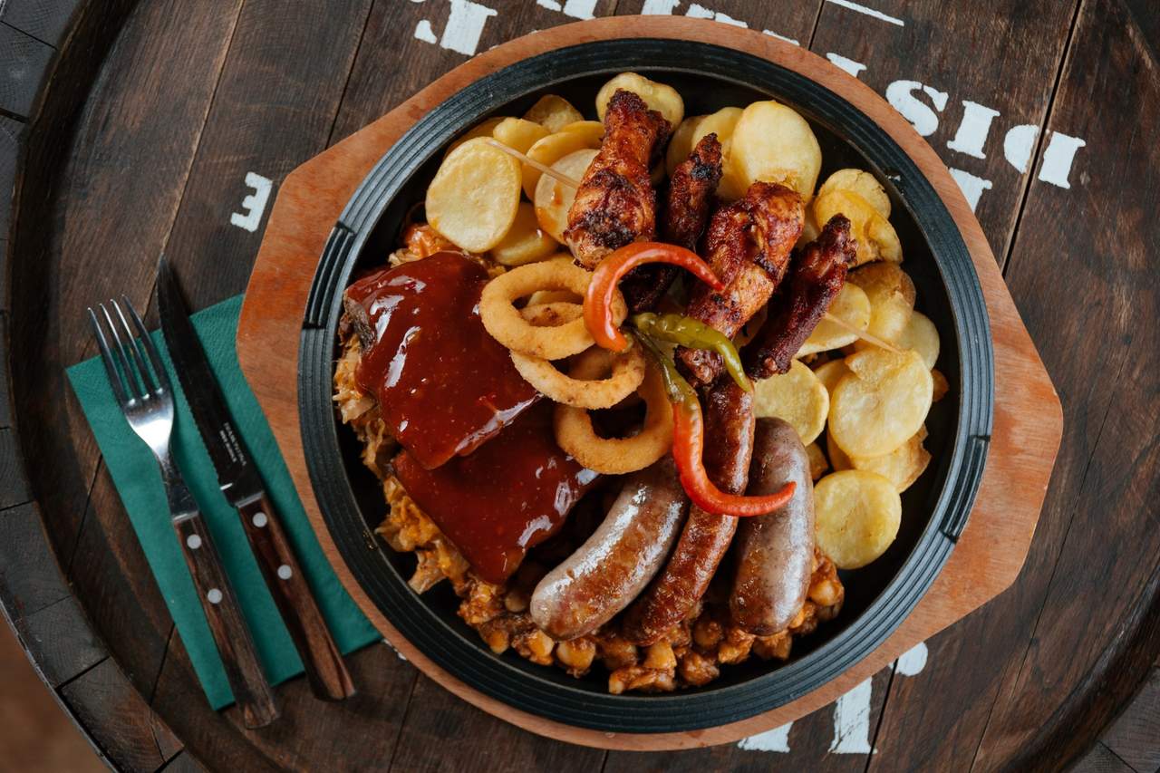 3 domaća jaja, pikantne roštiljske kobasice 120g, pasulj zapečeni prebranac, crispy slanina, sos na bazi majoneze